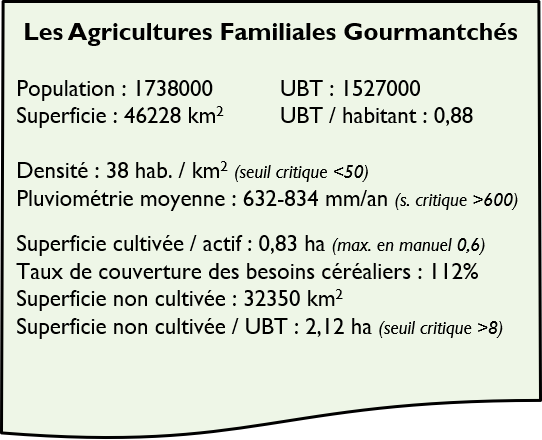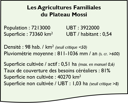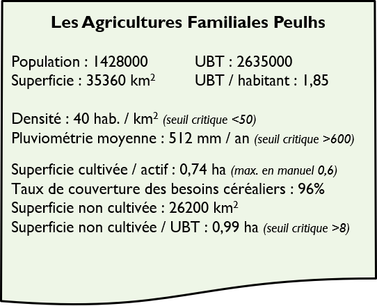 Ils disposent de deux à trois fois plus de bétail par habitant que les autres types d'agriculture familiale (1,85 UBT). En l'absence de fourrages cultivés, les troupeaux paissent sur les espaces non cultivés qui sont insuffisants : 1 ha non cultivé / UBT alors qu’il en faudrait 8. Les déficits fourragers sont donc très importants et la dégradation des ressources naturelles très sévère.