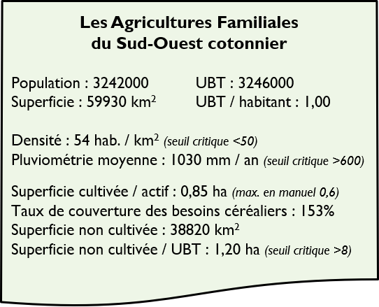 Dans la partie sud de leur espace, la pluviométrie plus abondante (834 mm) permet la culture cotonnière en traction animale, ce qui explique que la superficie cultivée par actif (0,83) soit nettement supérieure aux 0,6 ha possibles en culture manuelle.