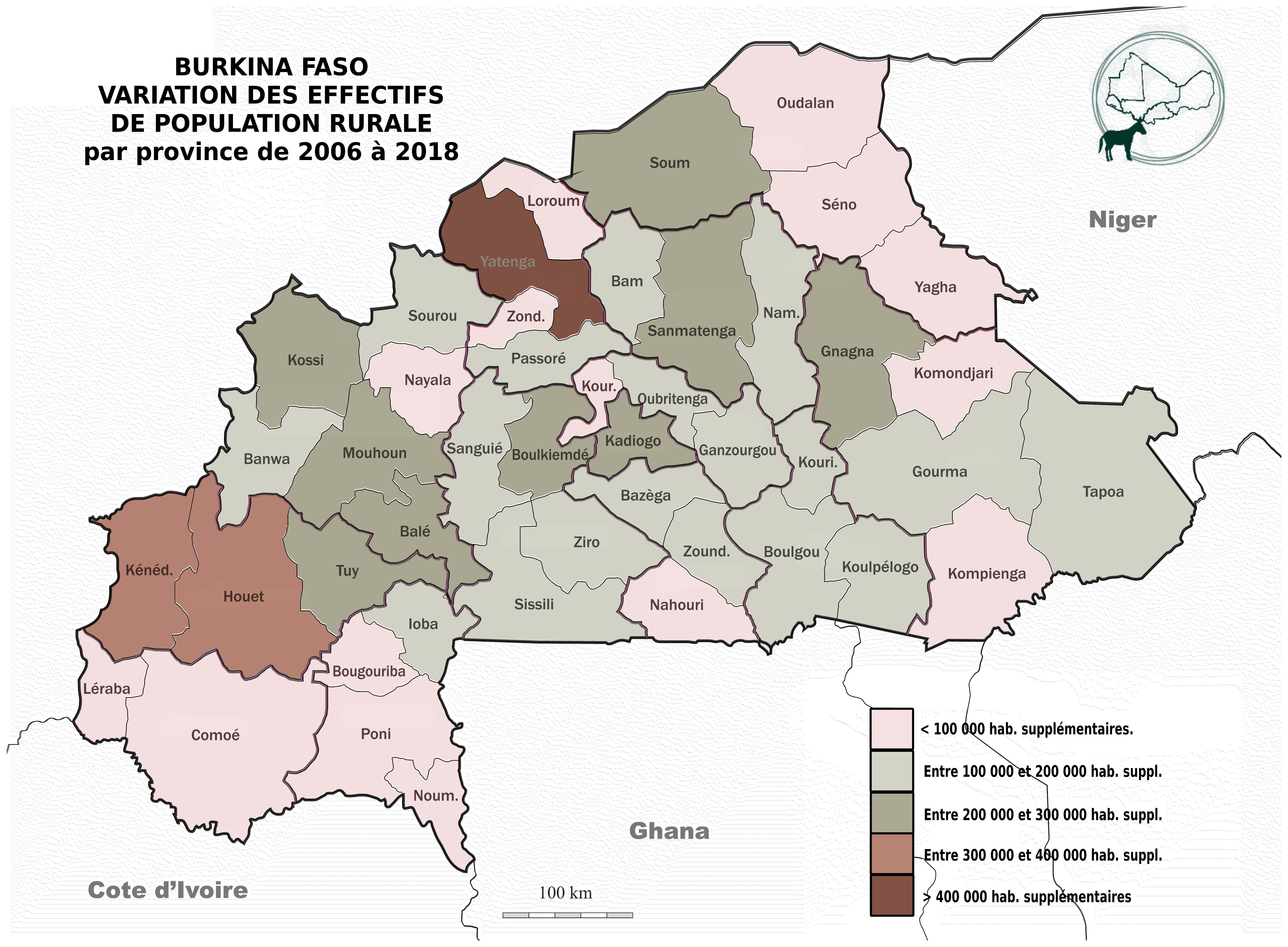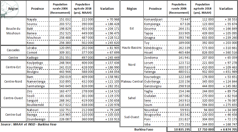 Les provinces seront inégalement impactées, selon qu'elles sont, ou non, déjà densément peuplées. Trois d'entre elles (le Yatenga dans le Nord, le Houet et le Kénédougou dans les Hauts-Bassins) ont vu leur population rurale augmenter de plus de 300000 habitants entre 2006 et 2018, soit douze ans.