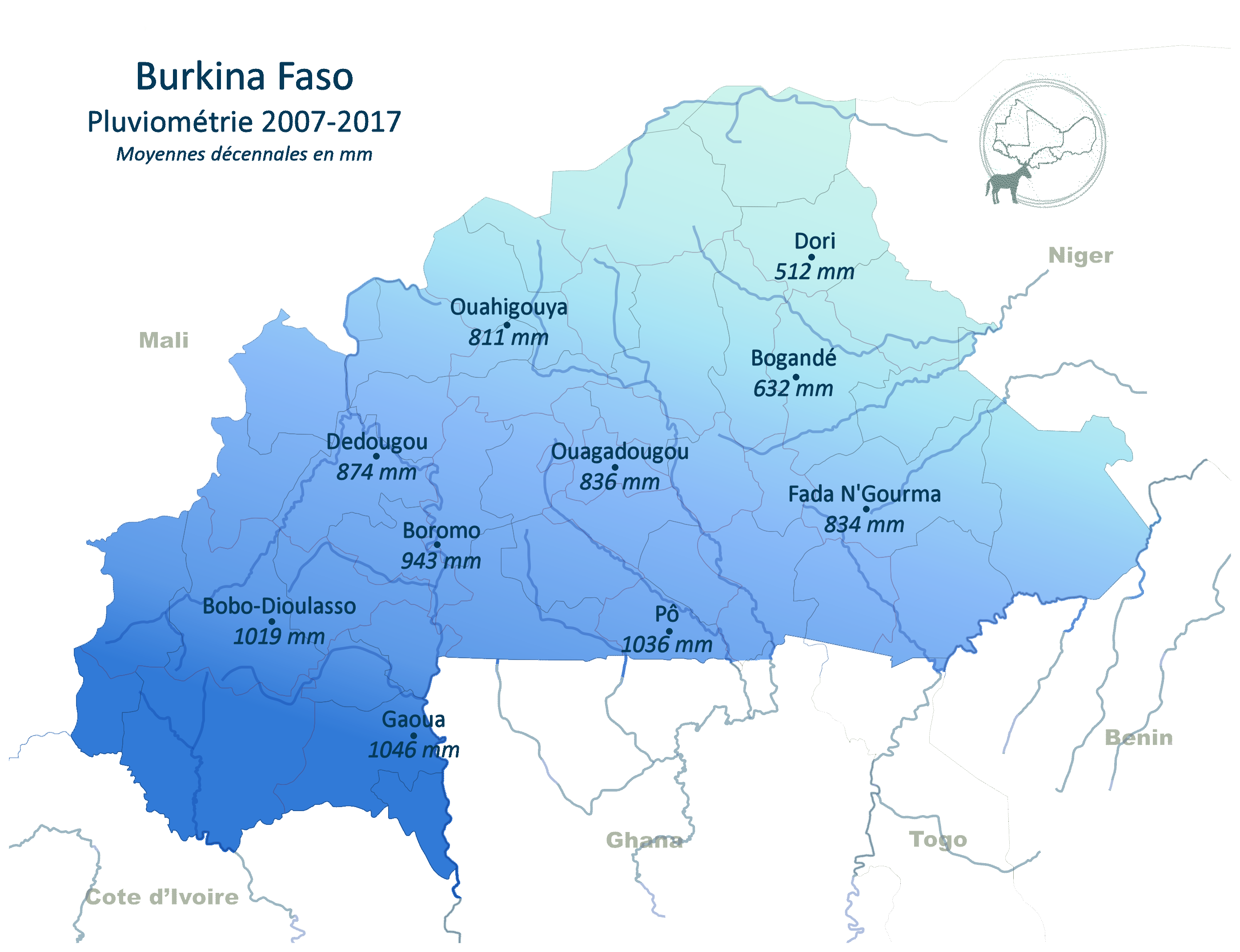 Les moyennes décennales de précipitations recouvrent une grande variabilité interannuelle, source d’incertitude pour les agriculteurs. S’y ajoute celle de la durée de la saison des pluies, susceptible de commencer tard (par exemple fin juillet) ou de s’arrêter tôt (par exemple dès la mi-septembre), et de ne pas assurer les 120 jours de pluie requis.